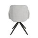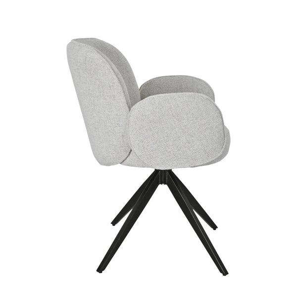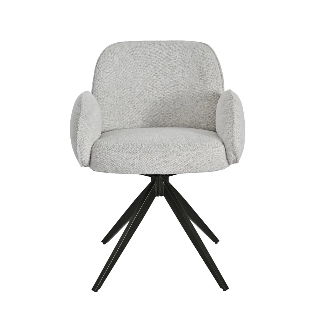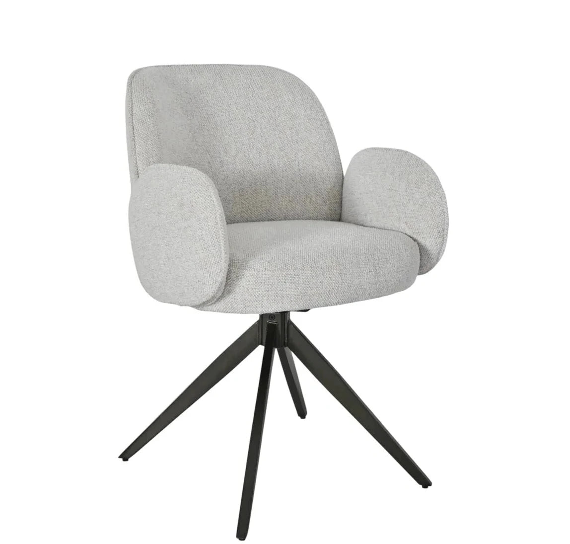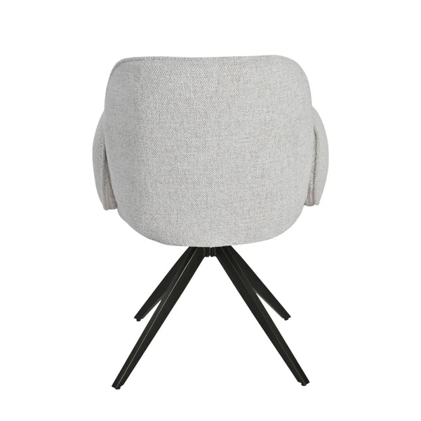Ses accoudoirs intégrés et son assise généreuse assurent un excellent maintien, tandis que son piètement en métal noir, à la fois stable et pivotant, ajoute une dimension fonctionnelle et graphique.