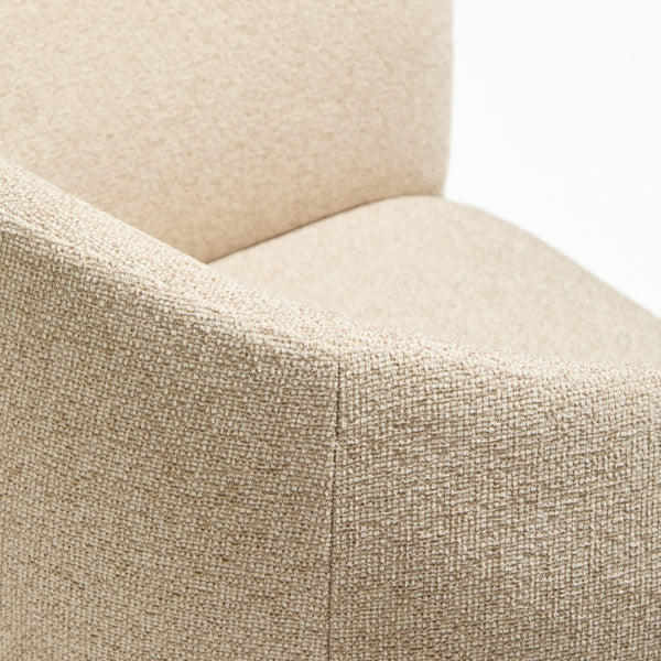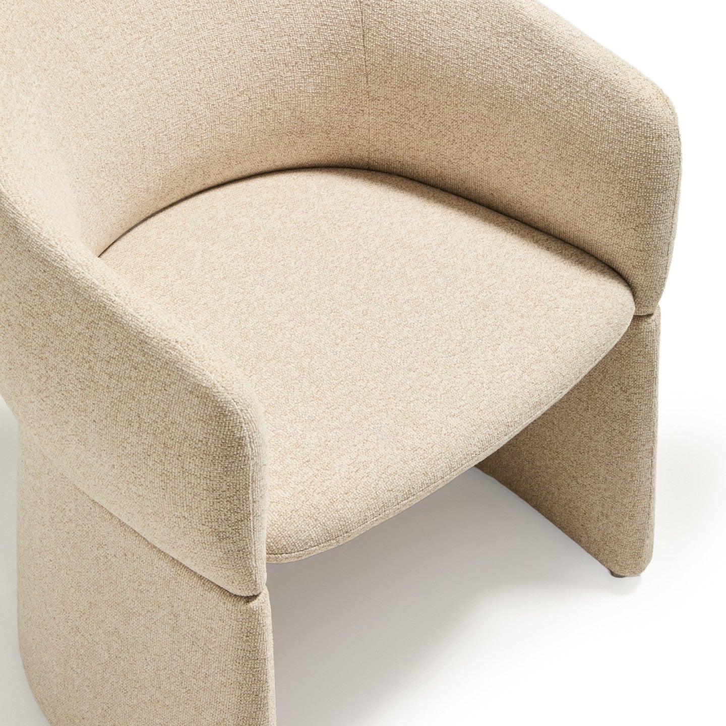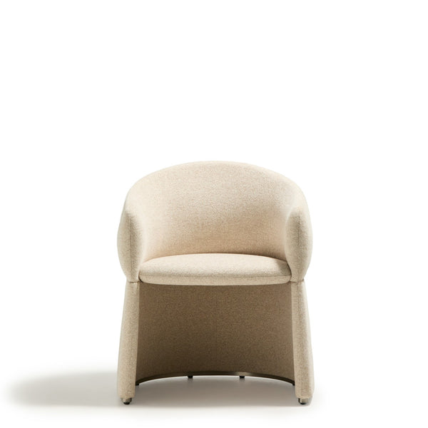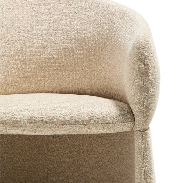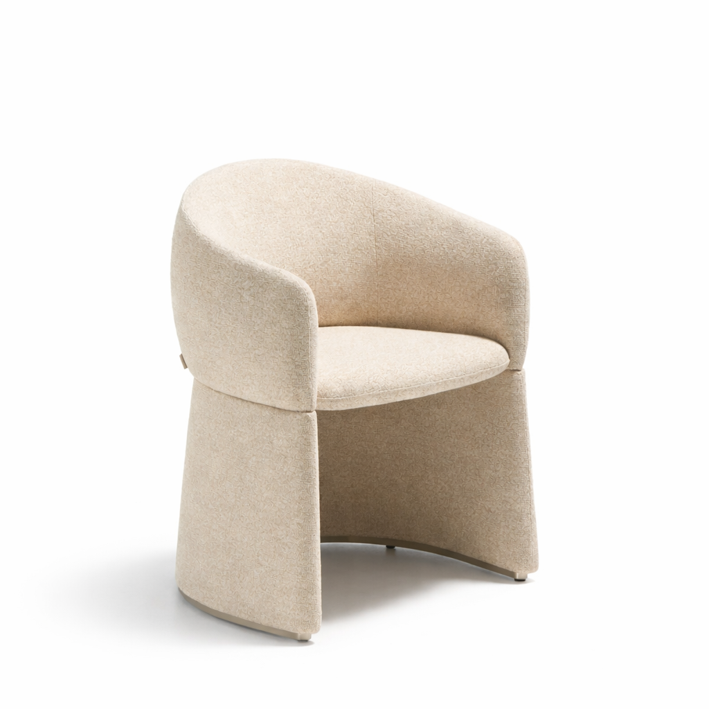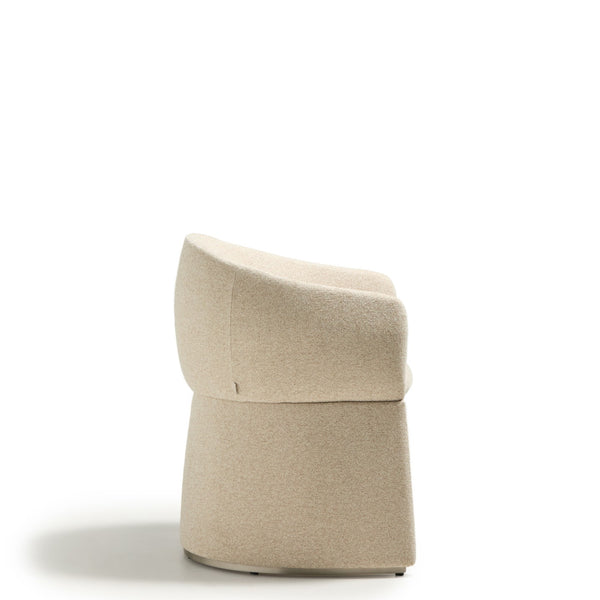 Cette chaise se démarque par son style sculptural, qui allie des formes généreuses et enveloppantes à une silhouette fine et élégante. L’assise large et accueillante repose sur une base en contreplaqué tapissé, entourée d’un cadre en métal pour protéger le tissu. Le revêtement est en chenille à petite structure : doux au toucher, résistant à l’utilisation quotidienne, et composé à 100 % de polyester recyclé provenant d’un fournisseur certifié Global Recycled Standard. Ce tissu a reçu un traitem