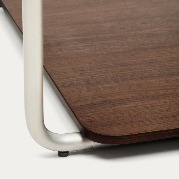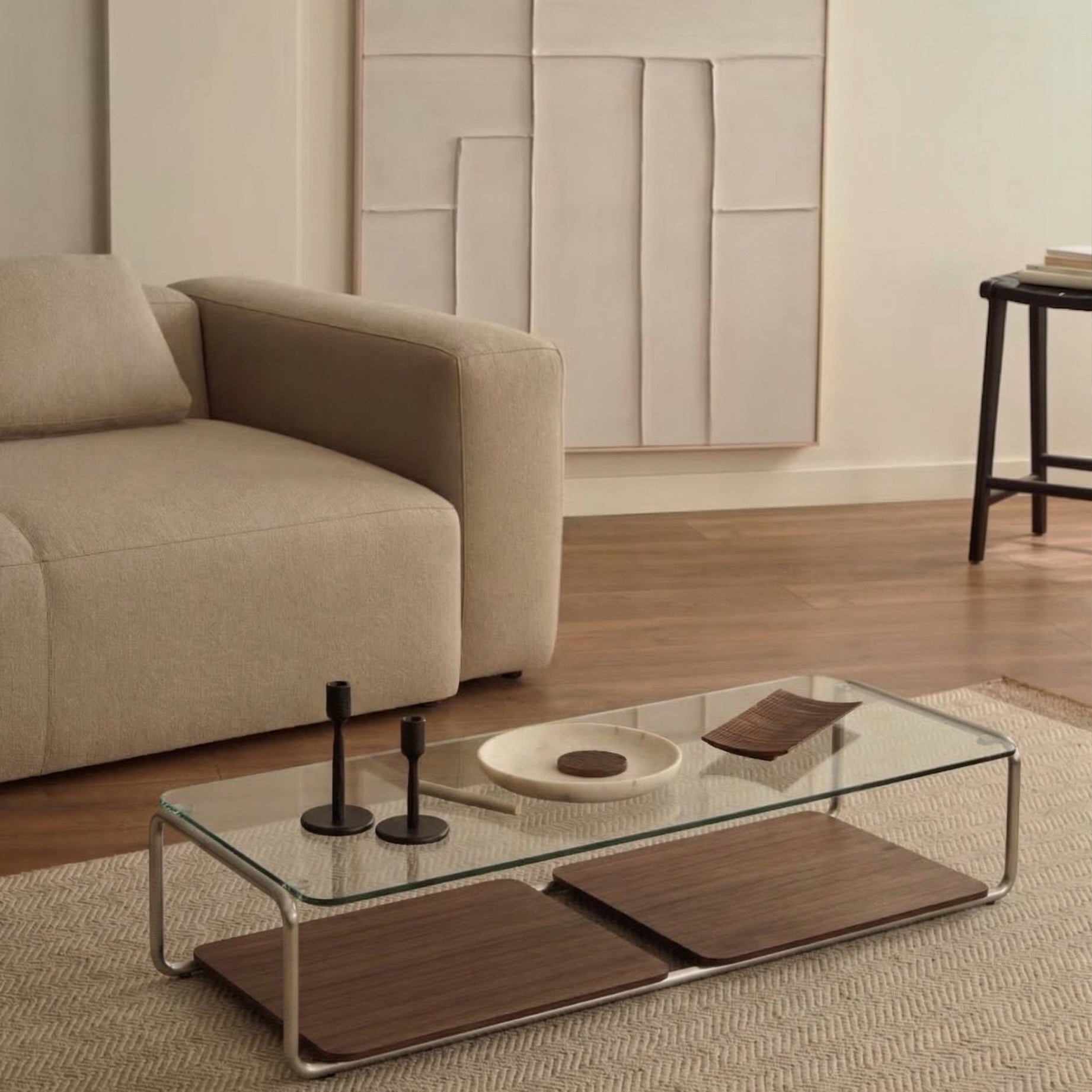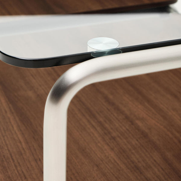 Tarsel interpretiert die Eleganz der Mitte des Jahrhunderts auf zeitgemäße Weise neu und verbindet dabei auf harmonische Weise Funktionalität mit raffinierter Ästhetik. Die Platte aus gehärtetem Glas verleiht dem Rohrgestell aus gebürstetem Edelstahl eine leichte Anmutung und sorgt gleichzeitig für einen Hauch von Modernität und Raffinesse.