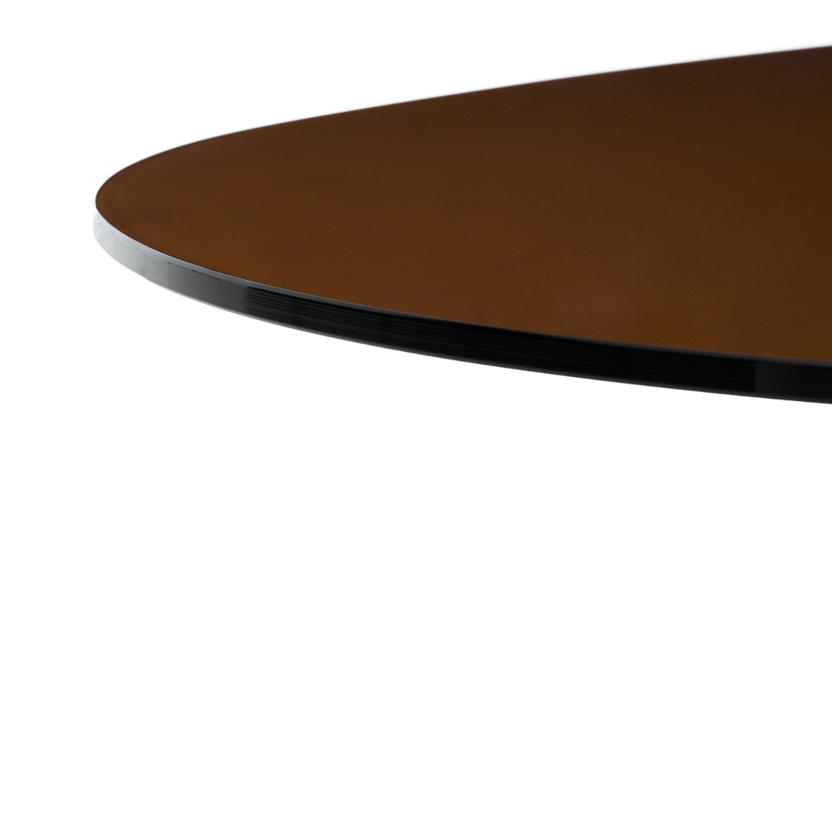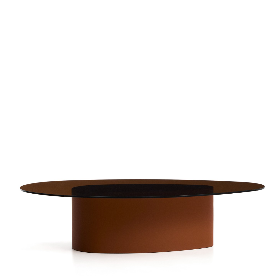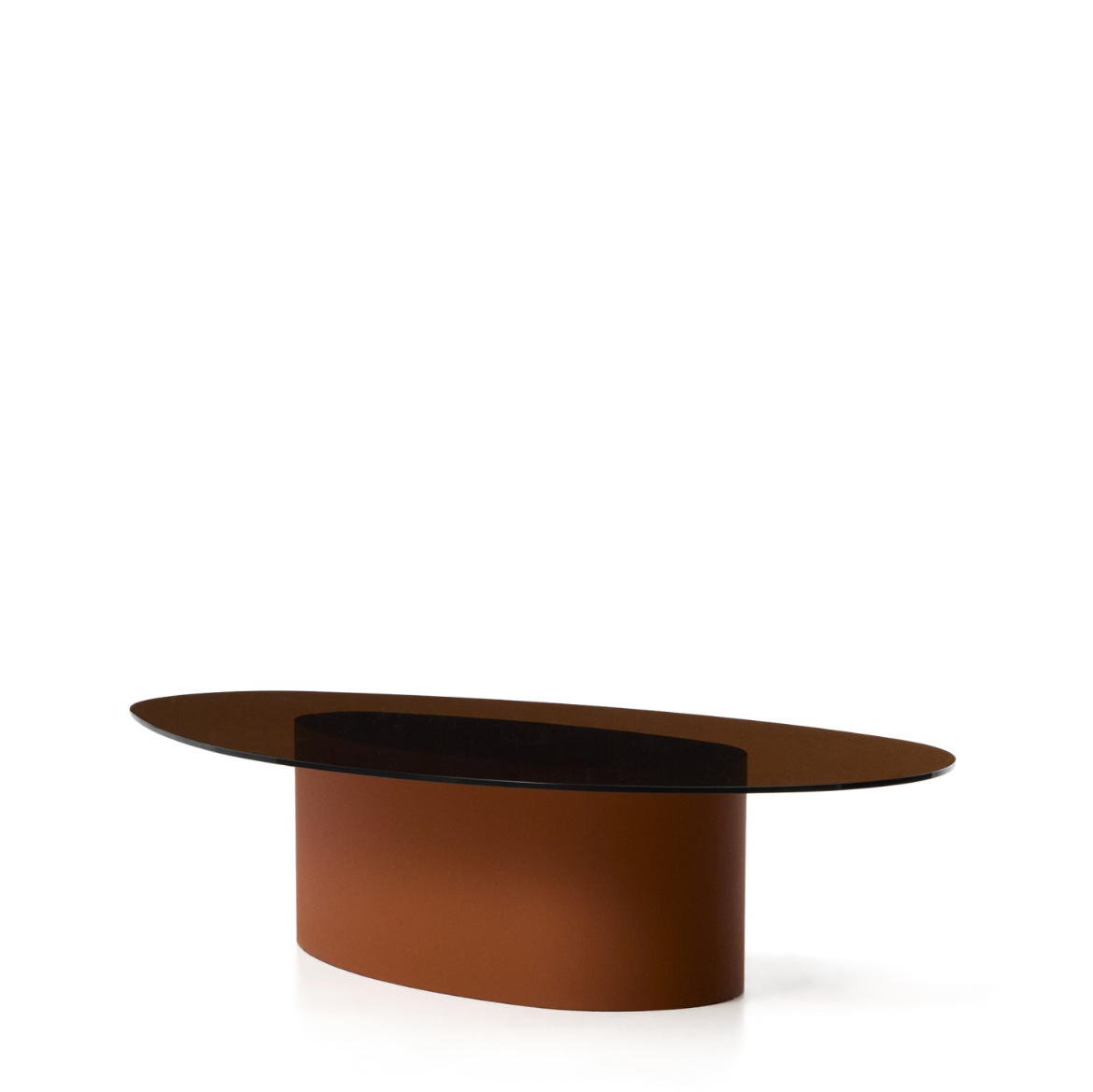 Der Tisch Olir kombiniert ein Stahlgestell mit einer Platte aus getöntem Hartglas und ergibt so ein Möbelstück mit organischen Linien. Die skulpturale Form des Gestells verleiht ihm Charakter und Stabilität, während das Glas das Gesamtbild abmildert und Licht durchlässt, wodurch ein leichteres visuelles Gefühl entsteht. Das Stahlgestell ist pulverbeschichtet, wodurch die Oberfläche vor Stößen, Kratzern und Abnutzung geschützt ist.