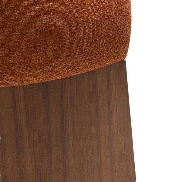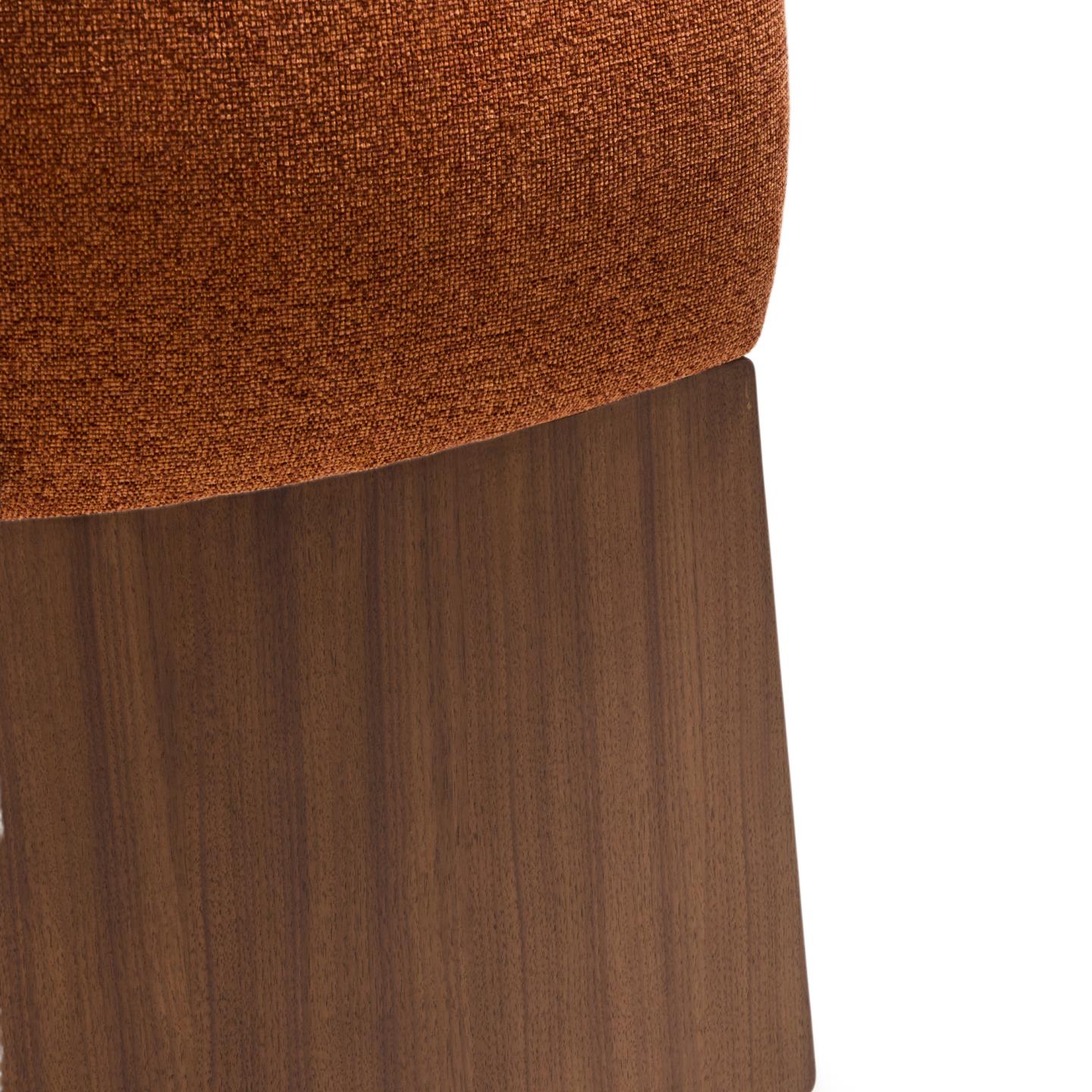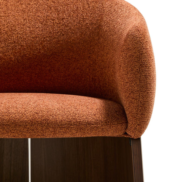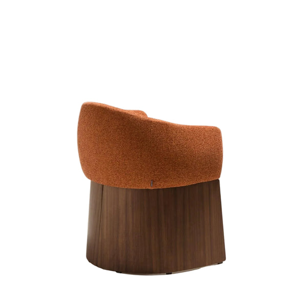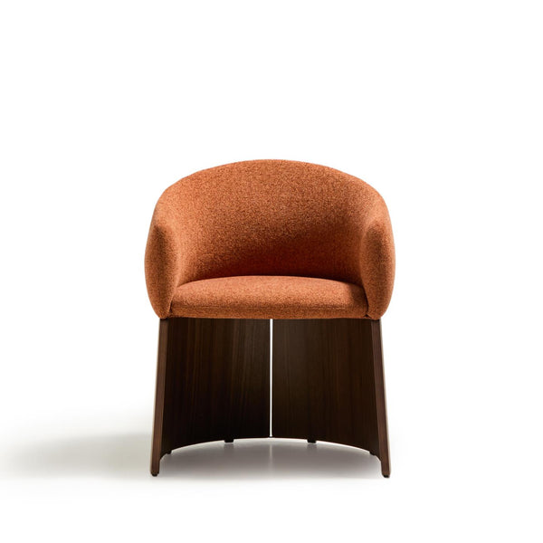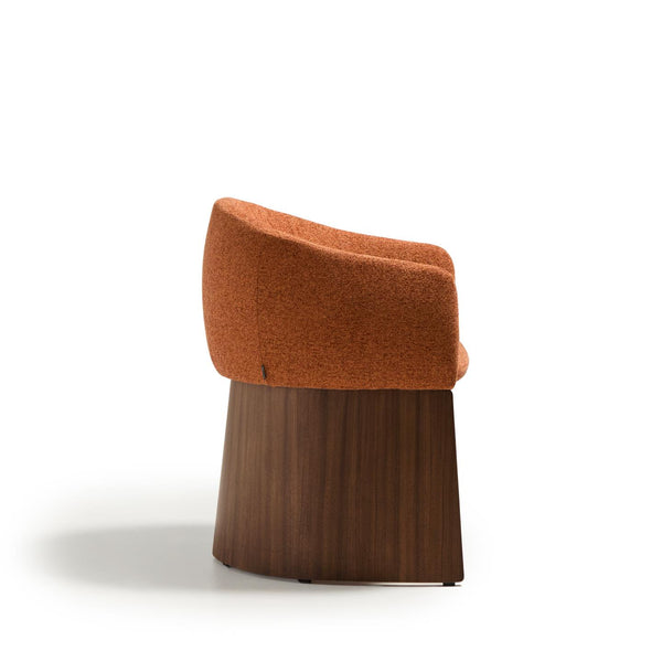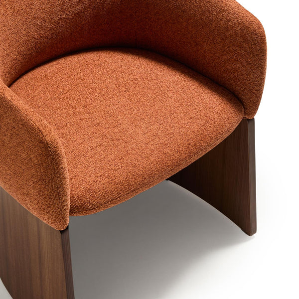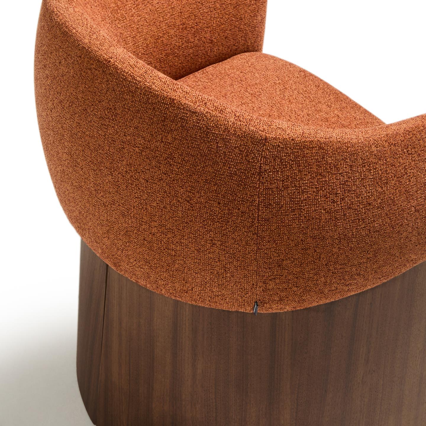 This chair stands out for its harmonious design, featuring a wide, comfortable seat supported by a wooden base finished in walnut veneer. The matte polyurethane finish protects the surface and gives the chair a warm, inviting look. The wood is certified under the FSC™ 100% Chain of Custody and a responsible forest management program.