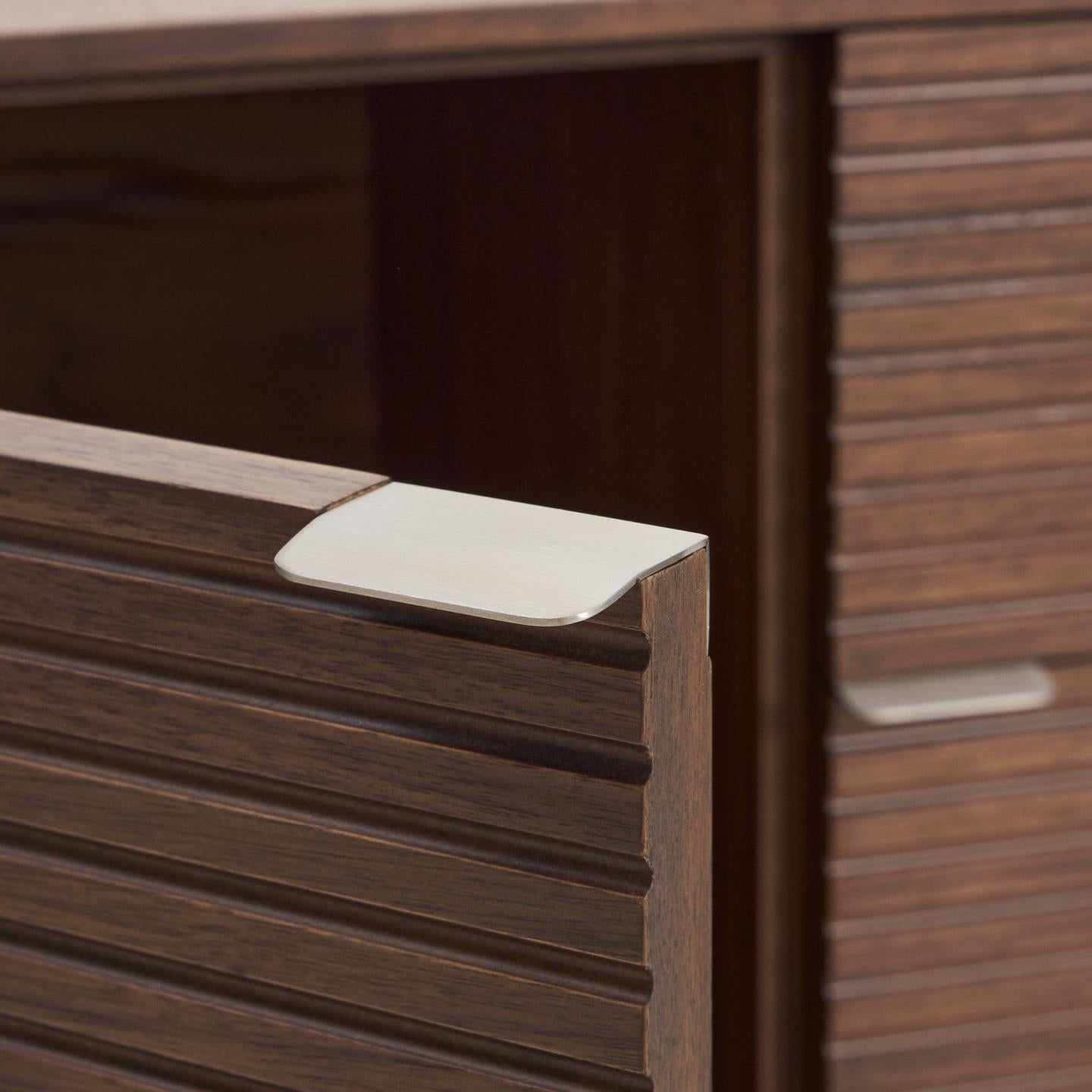Norlen pays homage to 1950s design while adding a contemporary twist, blending minimalist forms with vintage details. The slightly rounded corners and wooden base evoke a nostalgic atmosphere, reinterpreted with clean lines and modern proportions. The dark walnut veneer, applied using vacuum membrane pressing, blends harmoniously with the unit’s shelves, unifying the design while adding depth.